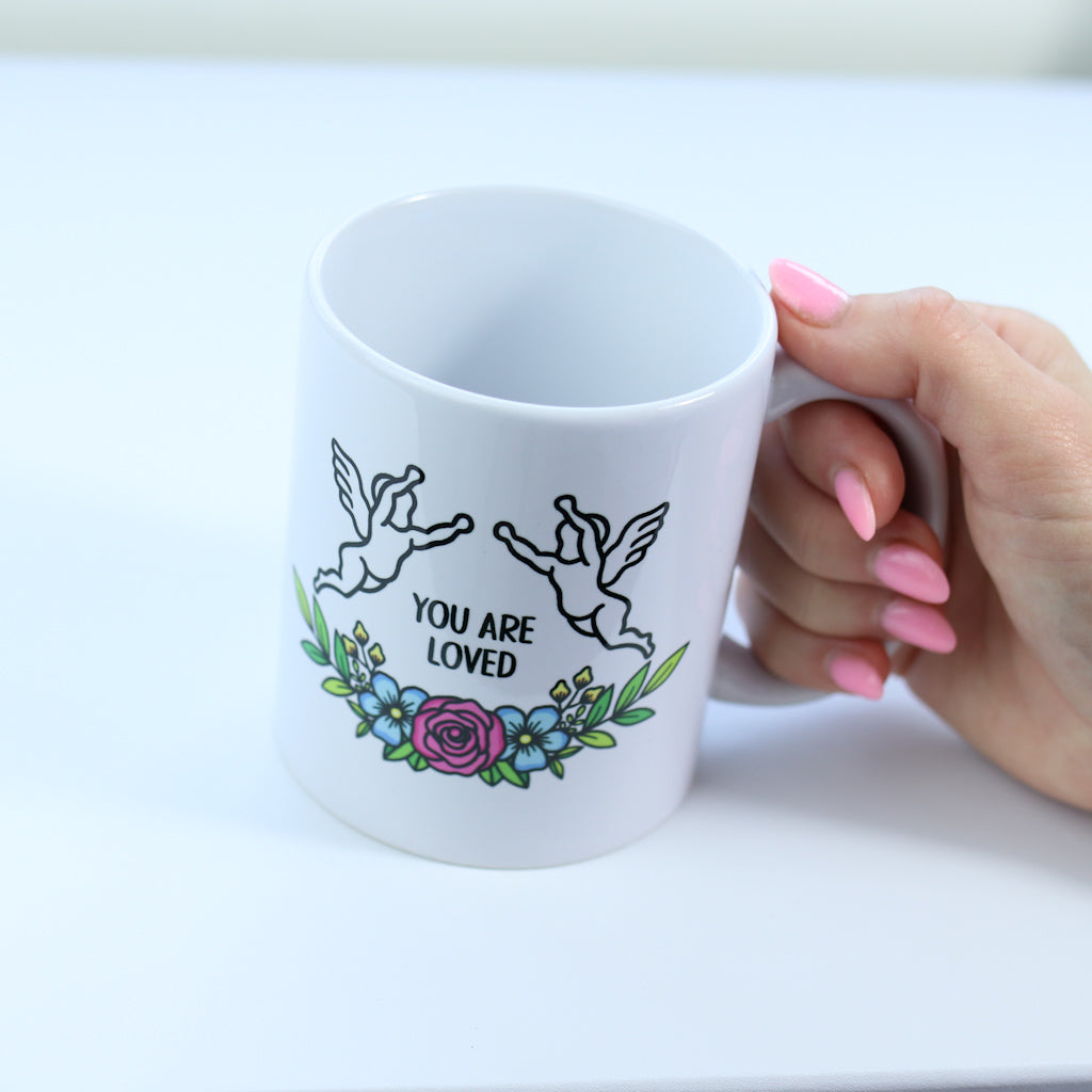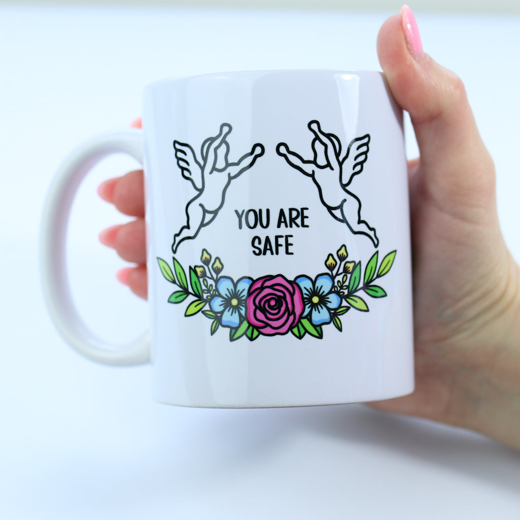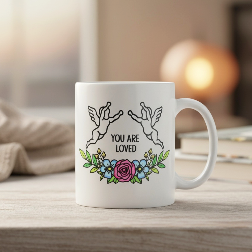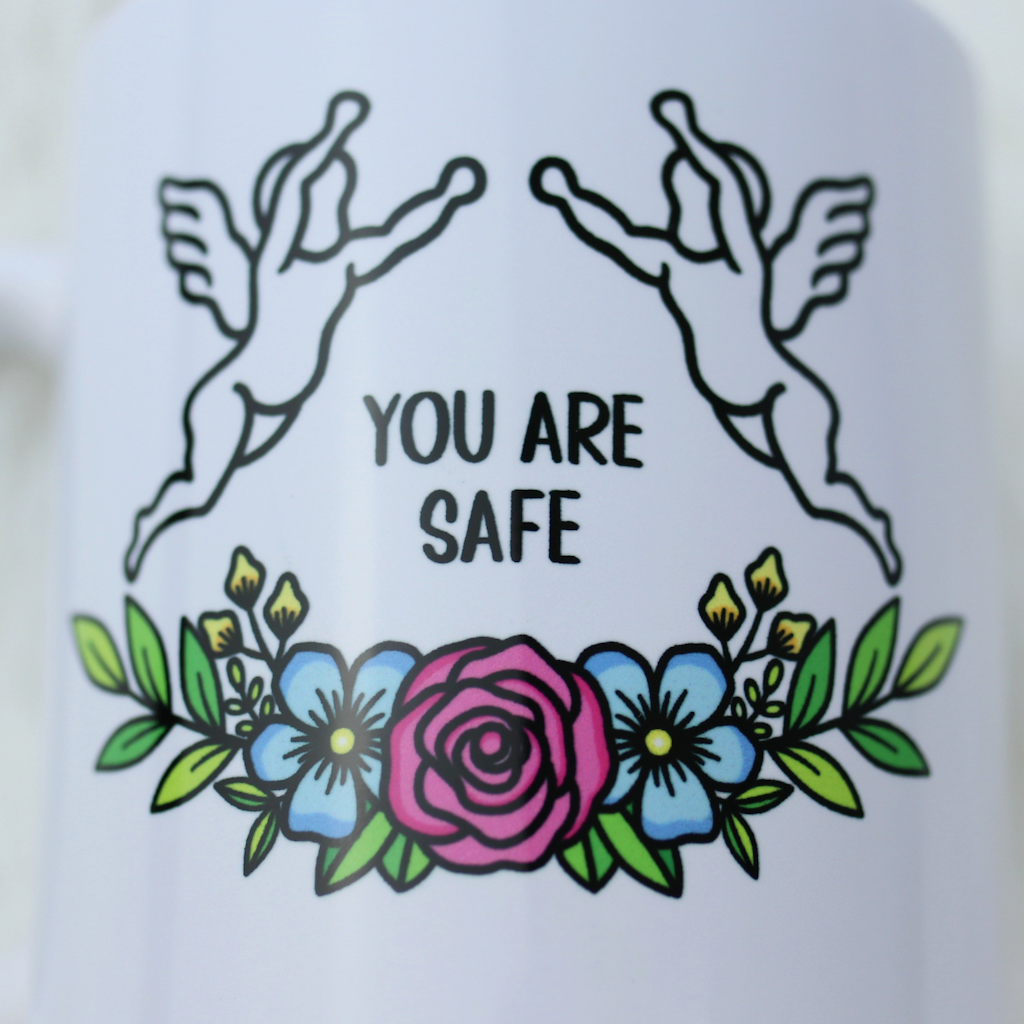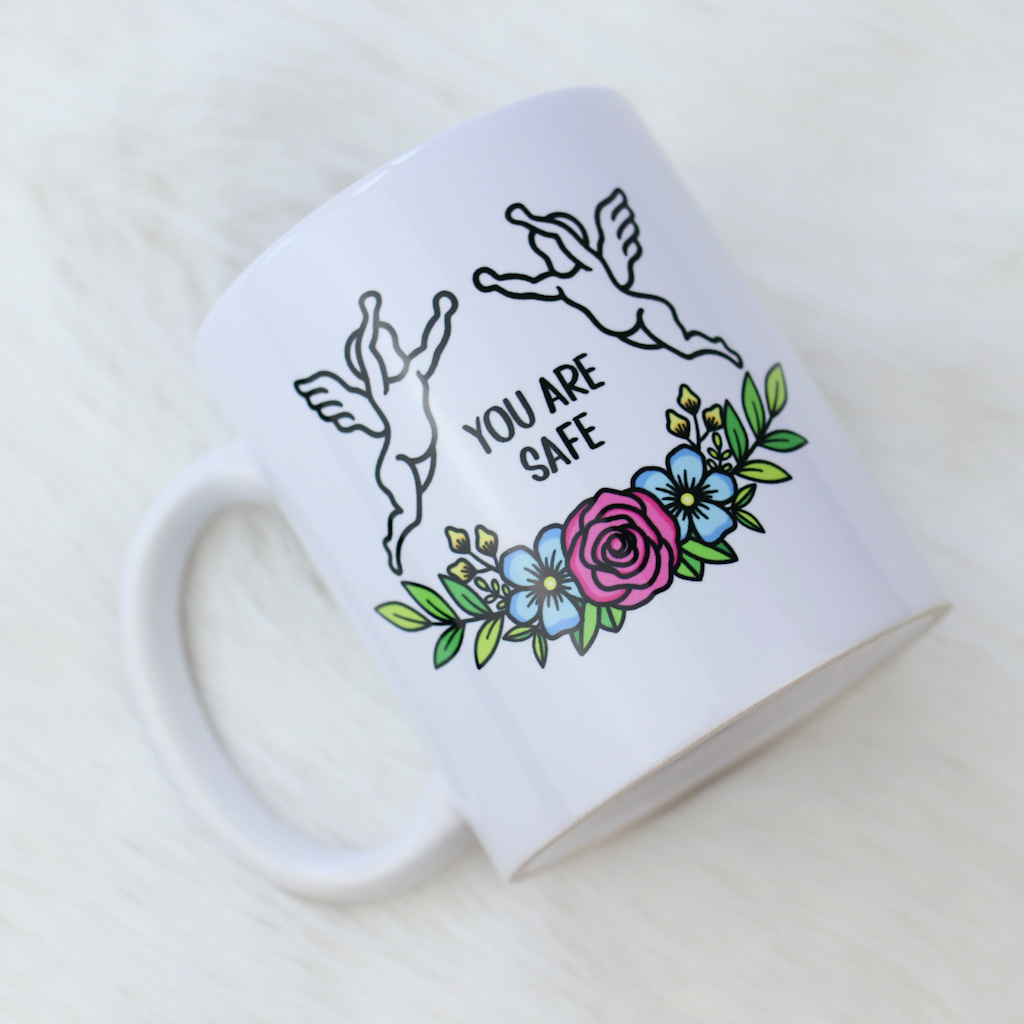 This simple and elegant white porcelain mug is designed to bring a moment of warmth and reassurance to your day. Printed with you are safe on one side and you are loved on the other, it features the same soft angel and flower design used throughout the collection, creating a cohesive and comforting piece.