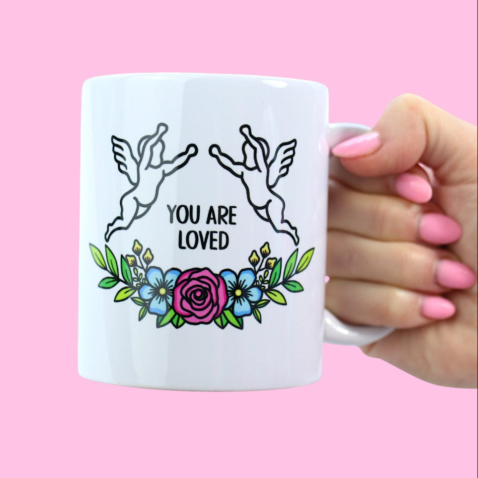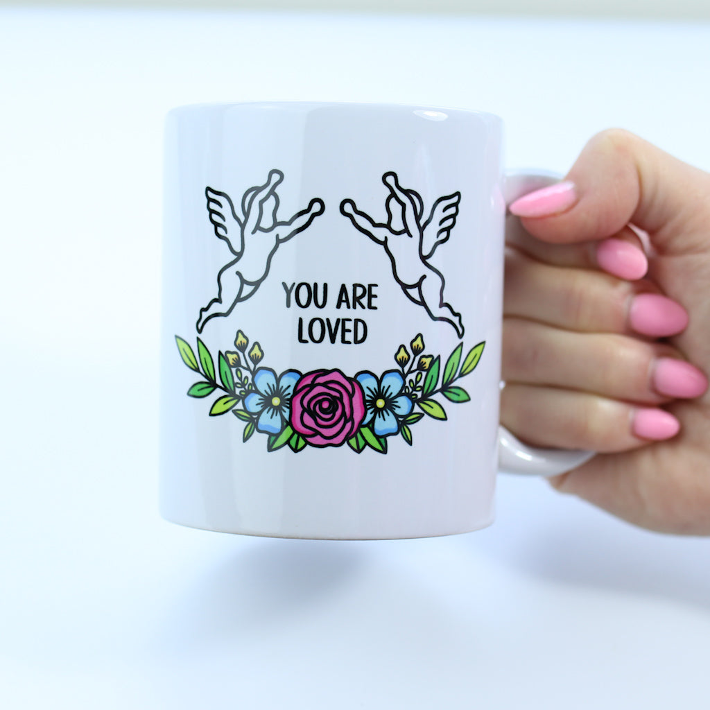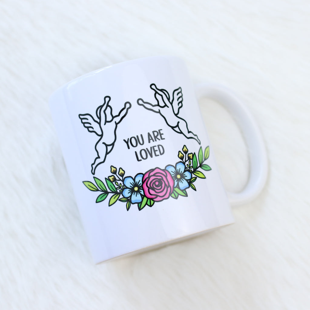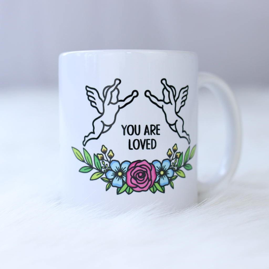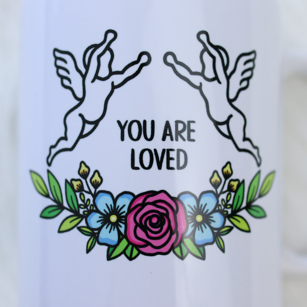 This simple and elegant white porcelain mug is designed to bring a moment of warmth and reassurance to your day. Printed with you are safe on one side and you are loved on the other, it features the same soft angel and flower design used throughout the collection, creating a cohesive and comforting piece.