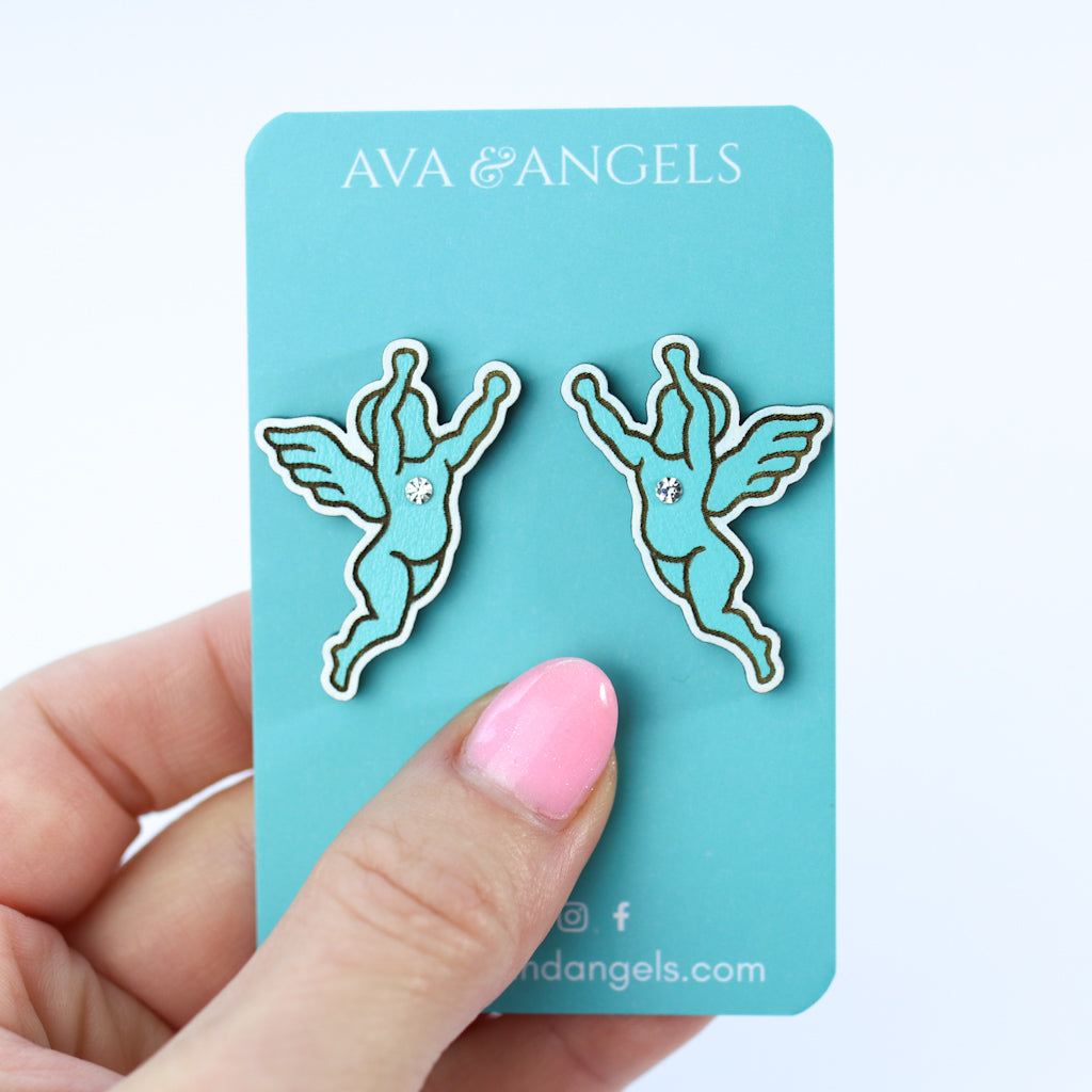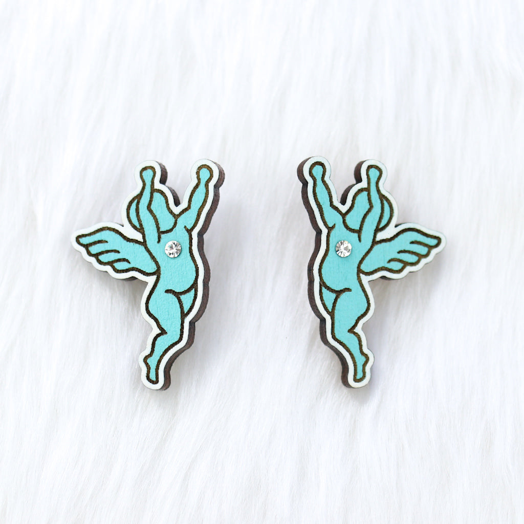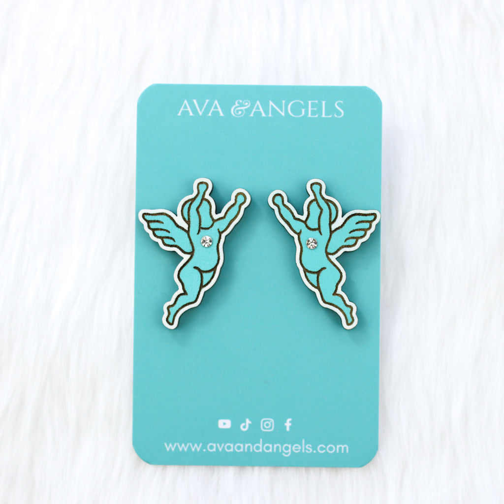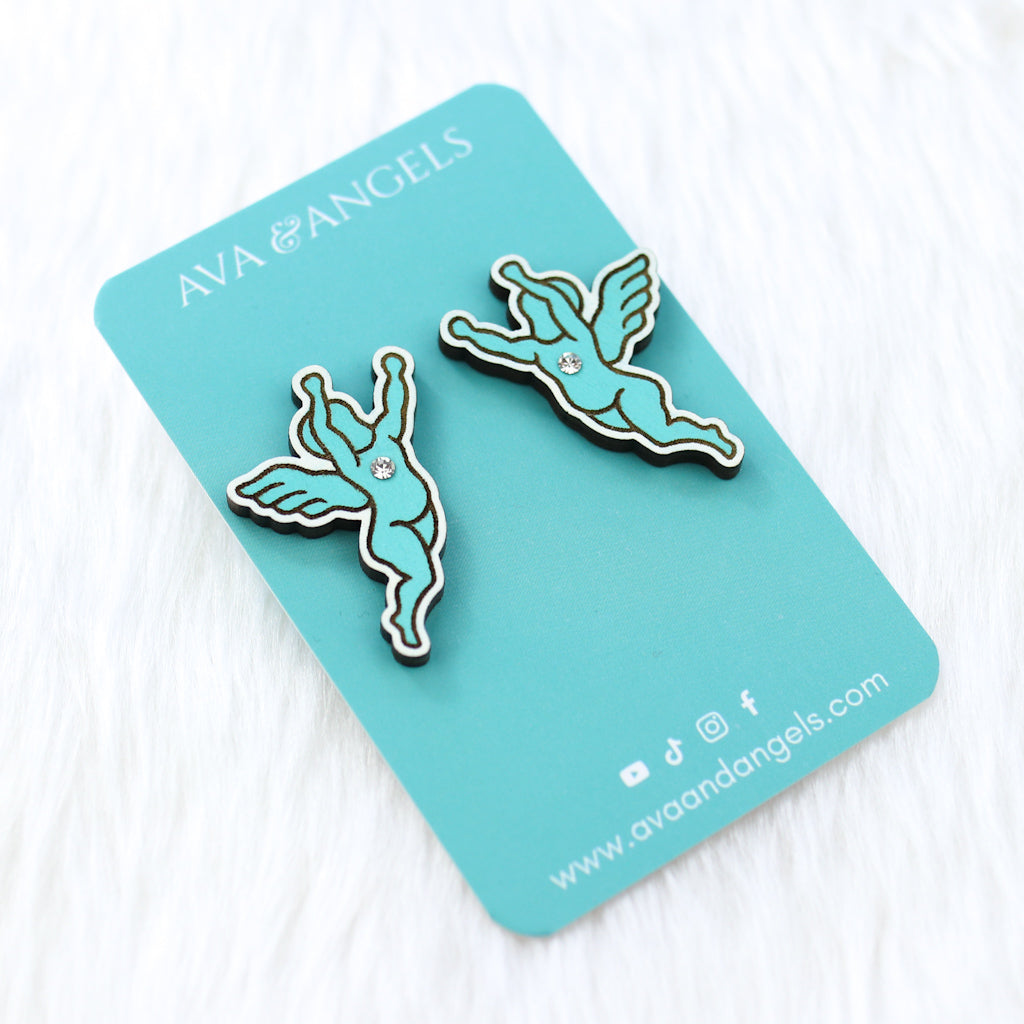 A tiny rhinestone sits at the center of each angel’s chest, adding a subtle sparkle that catches the light beautifully. The pins come as a matching pair and are secured with mint green silicone pin backs for comfort and a secure hold.