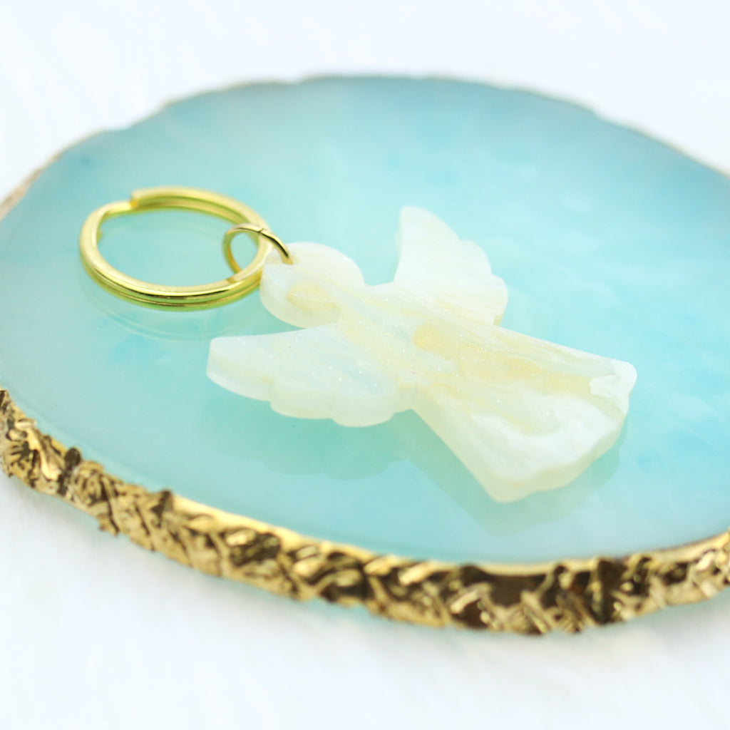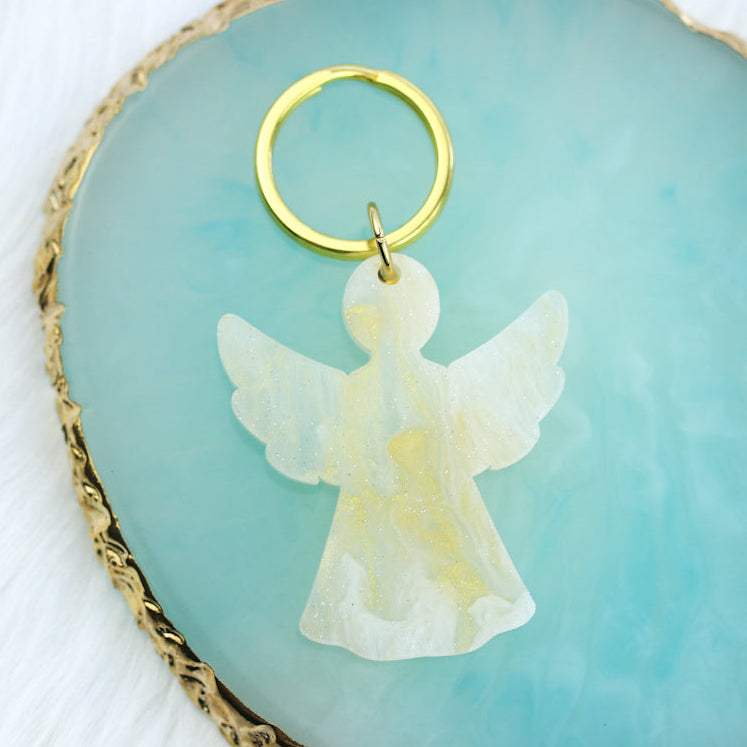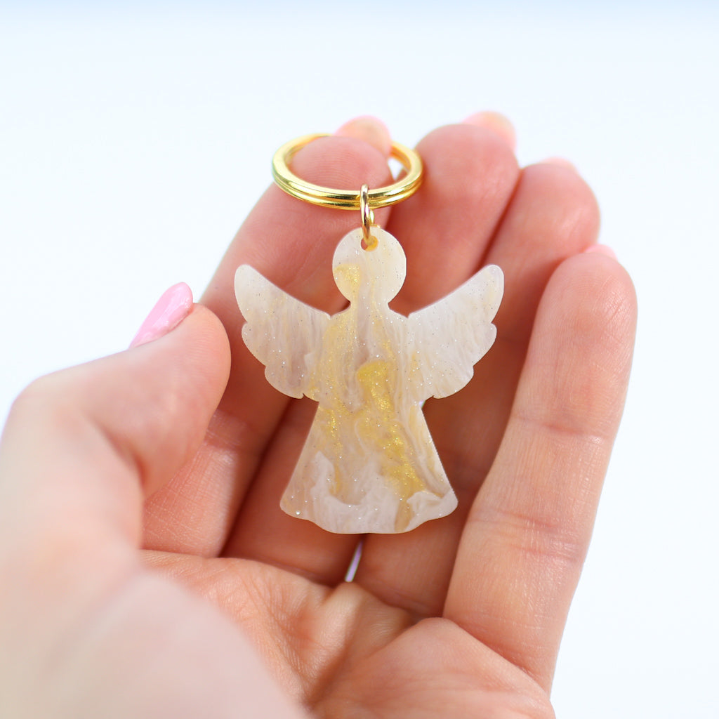 A lightweight, laser cut angel keychain made from gold and white pearlescent glitter acrylic. The angel silhouette has a smooth, polished finish that catches the light beautifully.