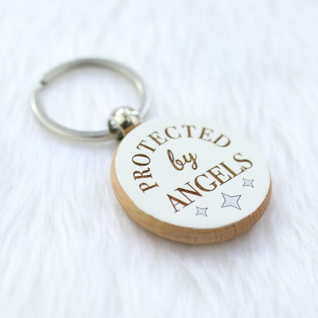 A laser-engraved and hand-painted wooden keychain, created in soft, soothing colours and sealed for lasting durability.