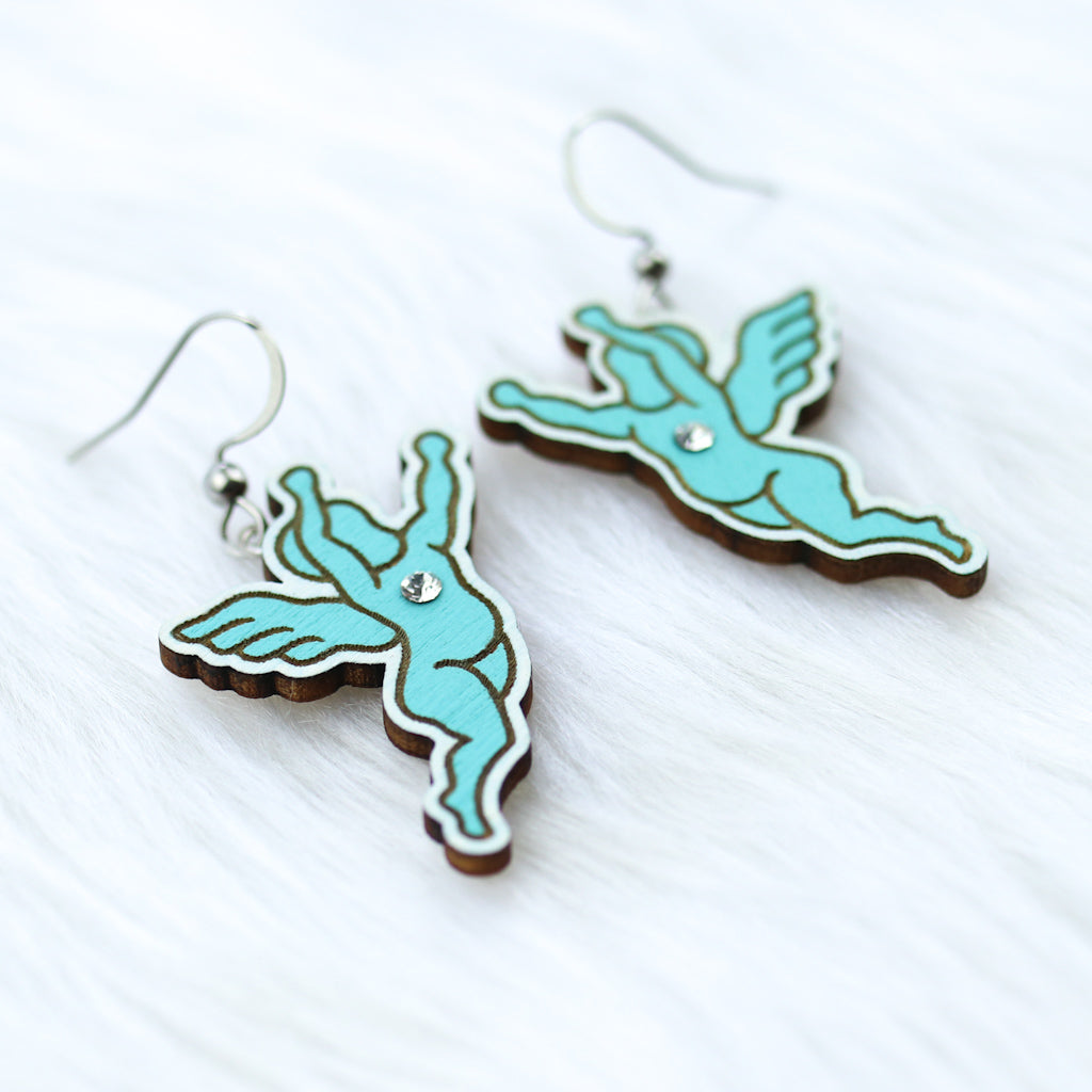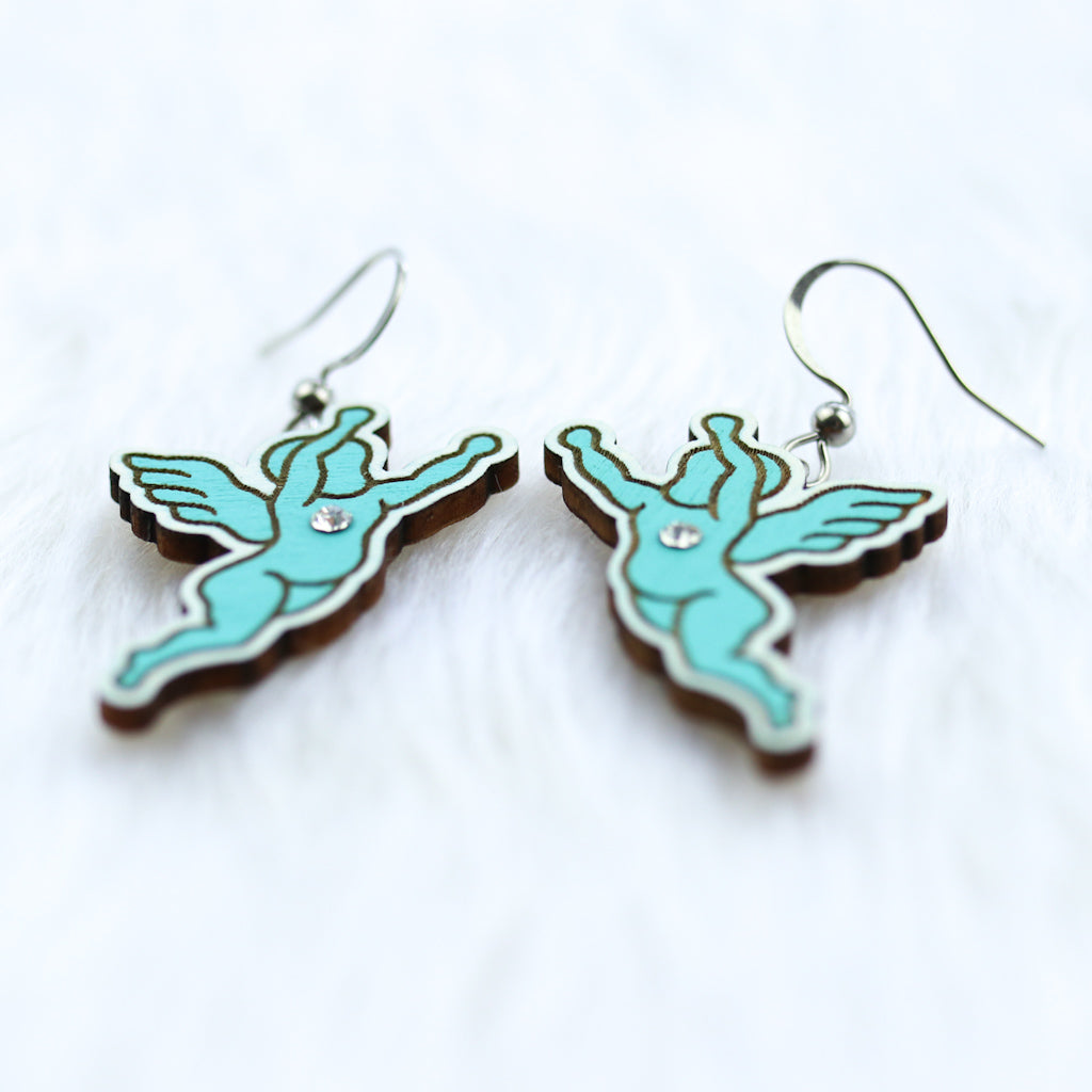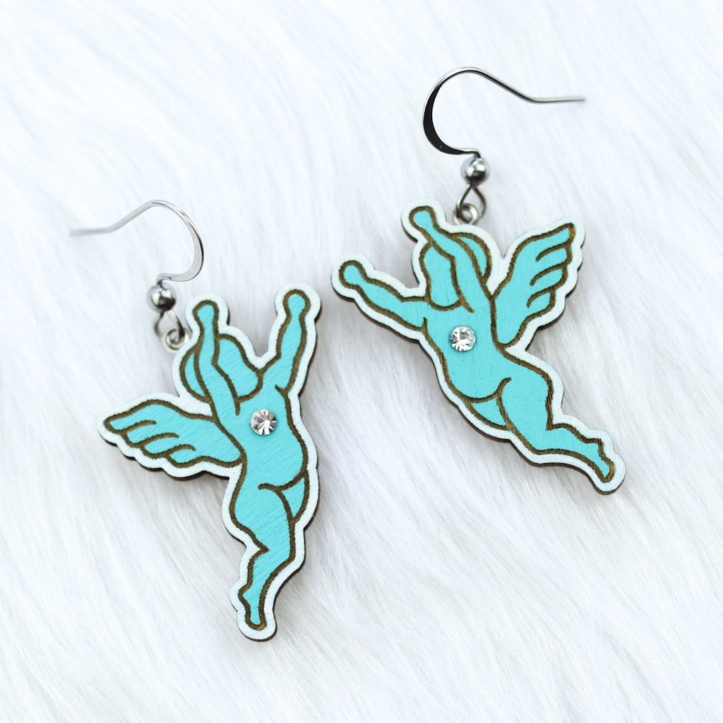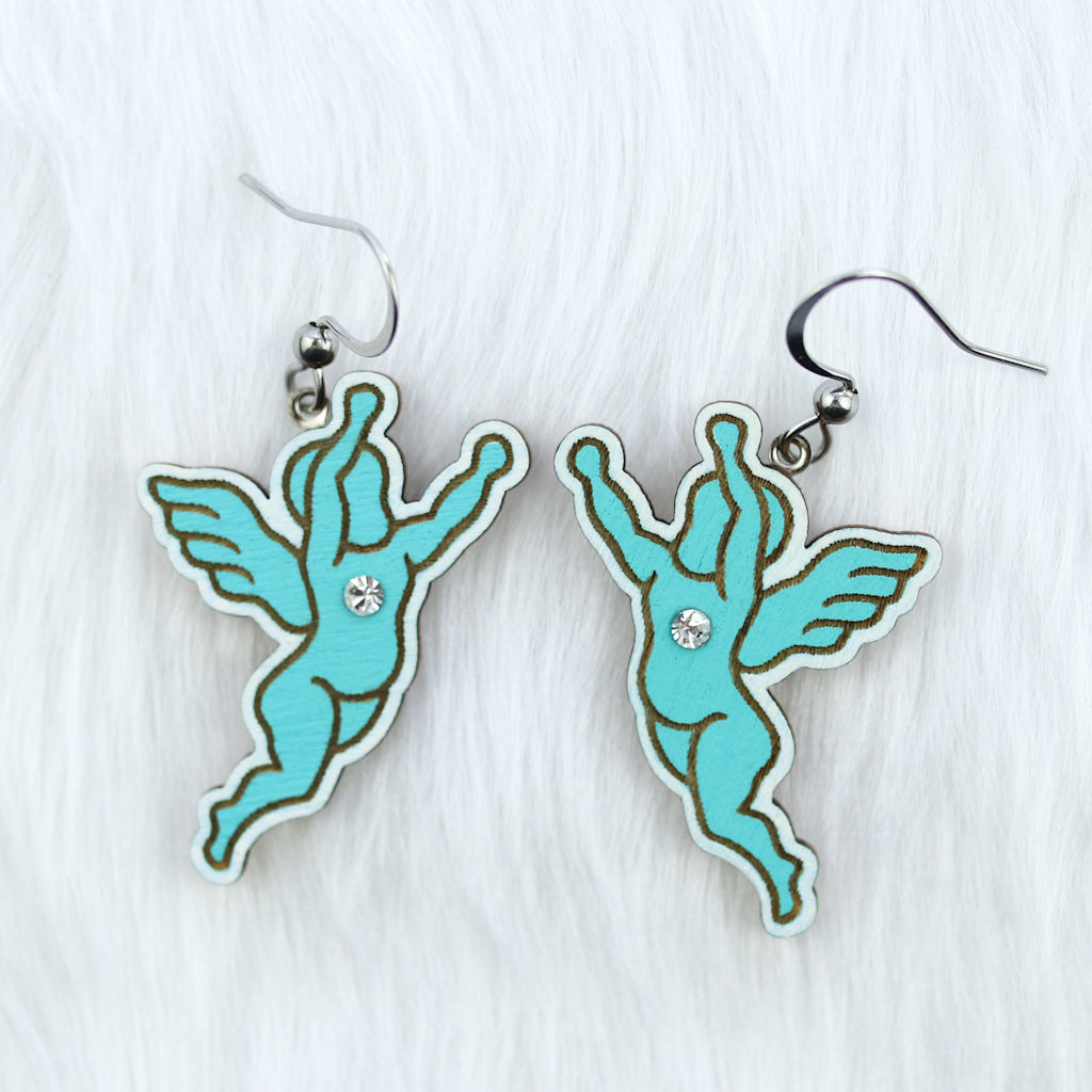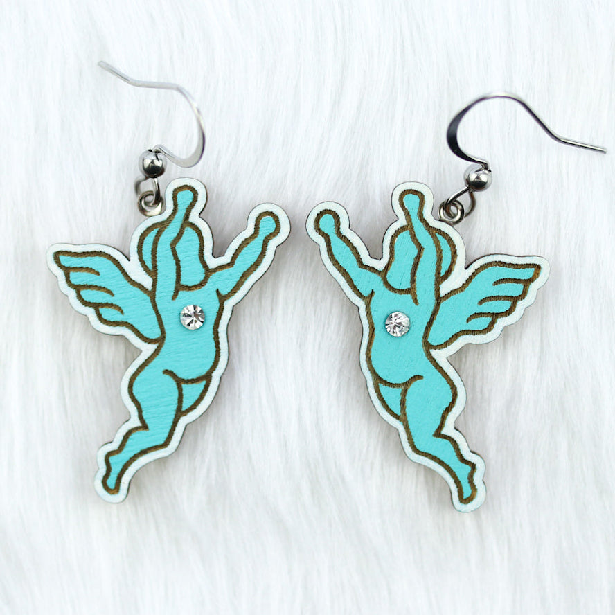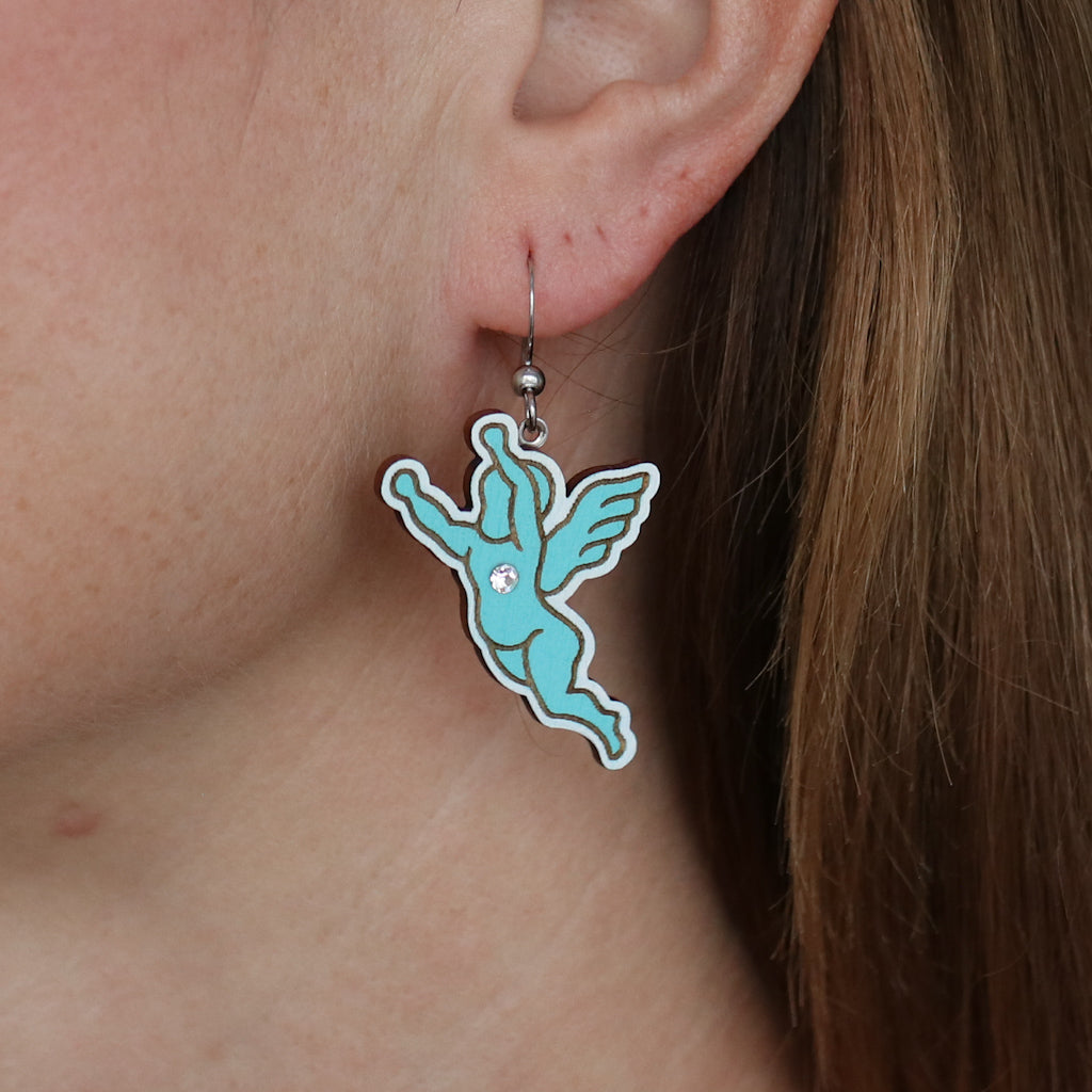 These charming wooden angel cutout earrings bring a soft, elegant touch to your everyday style. Each pair is laser cut, laser engraved, and hand painted.