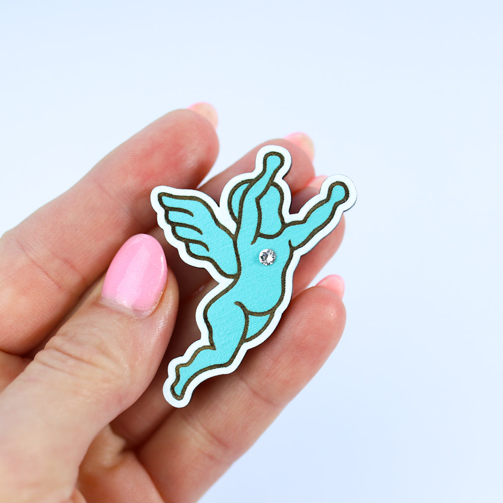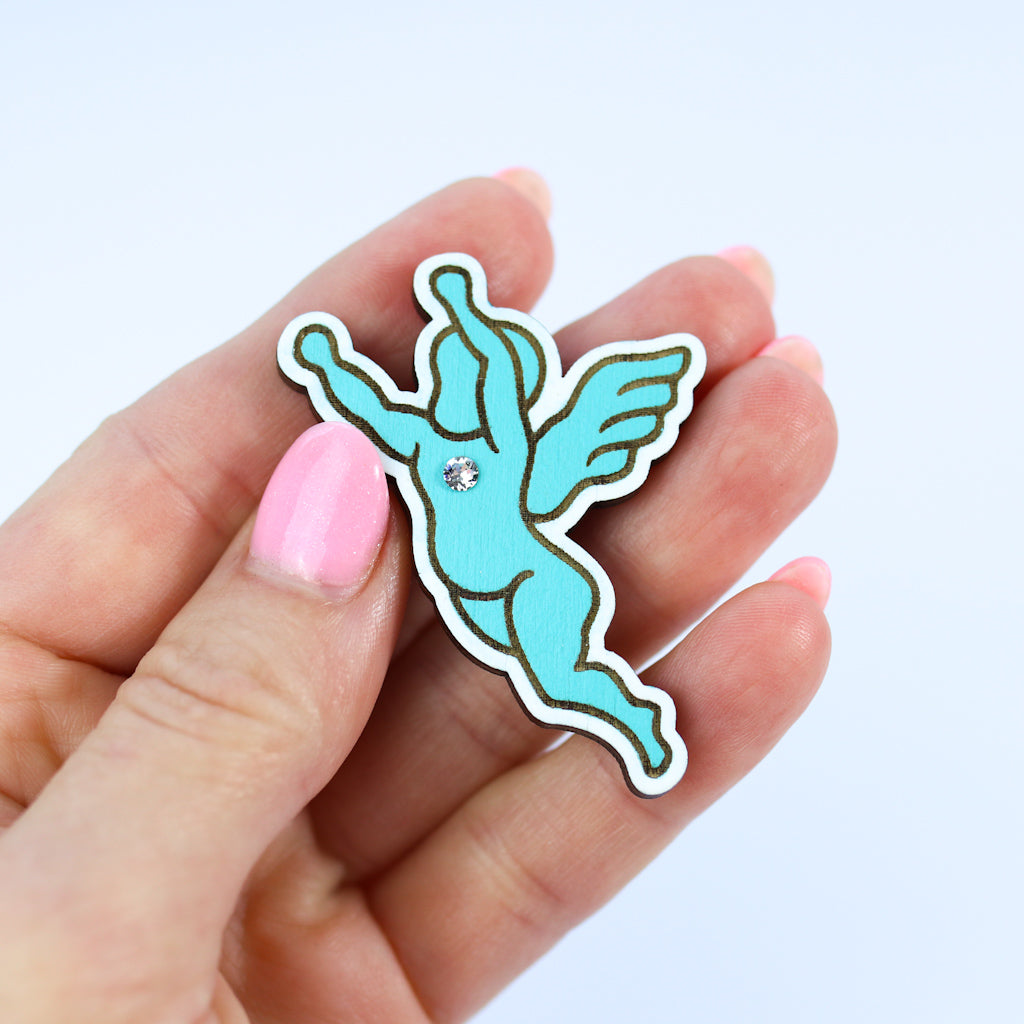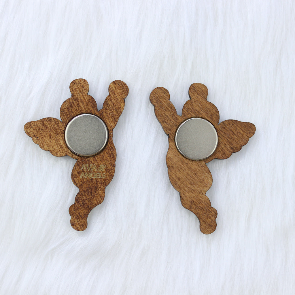 This pair of wooden angel magnets is a sweet and gentle addition to any fridge, memo board, or workspace. Each angel is laser cut from birch plywood, laser engraved for detail, and hand painted in soft, calming colours that match the rest of the collection. A small crystal rhinestone is placed in the centre of each angel’s chest, adding a subtle sparkle when the light catches it.