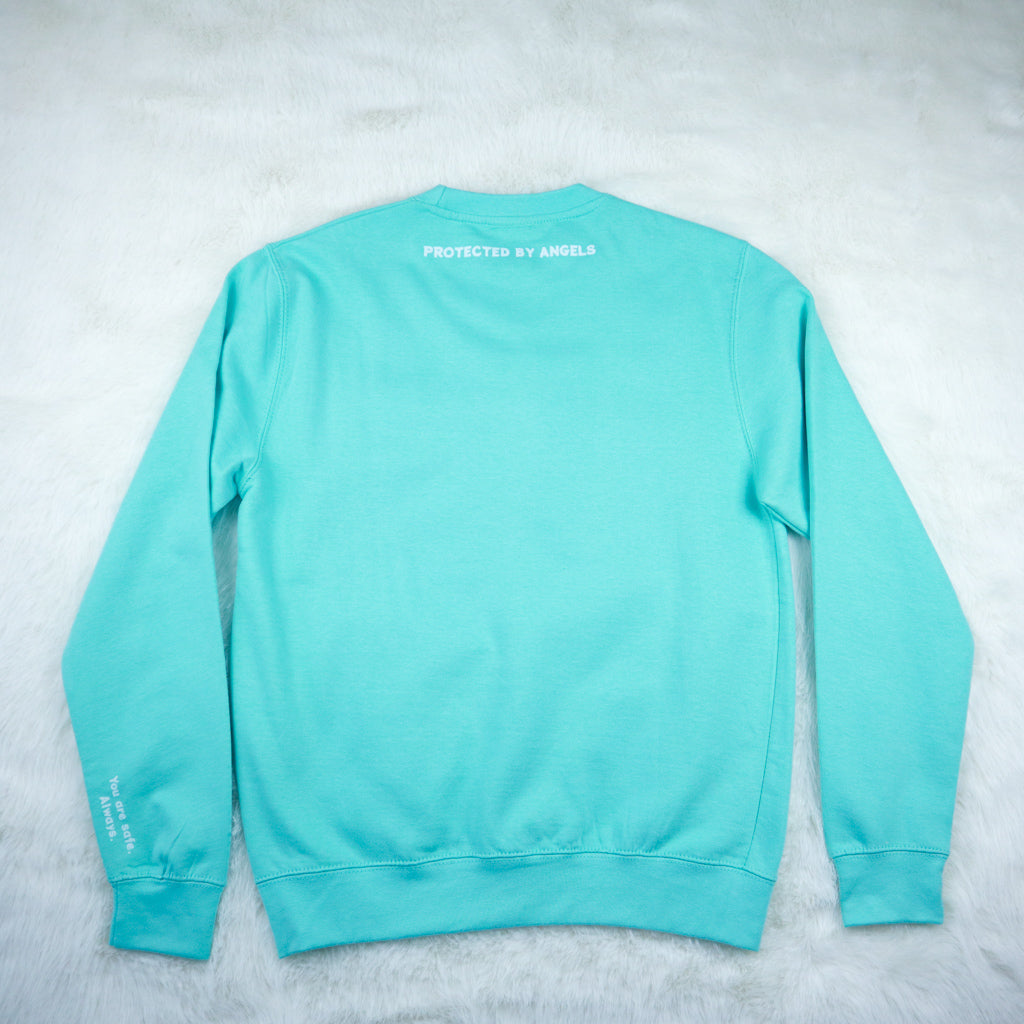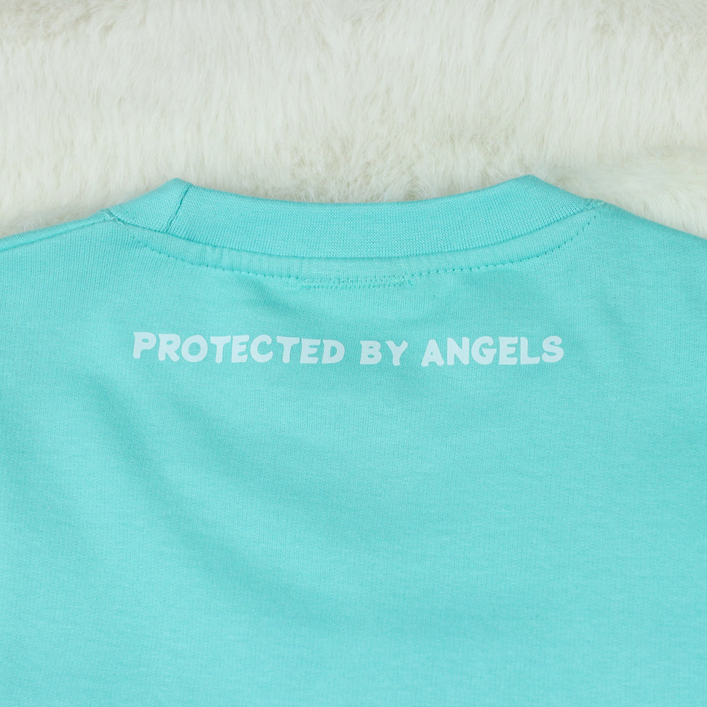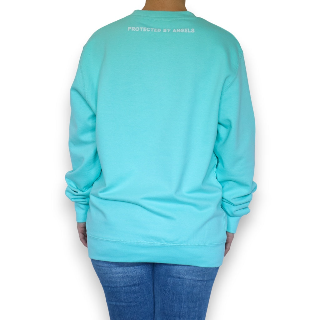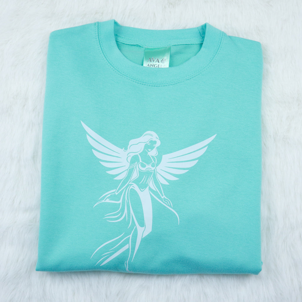 A soft, comfortable dark blue/green sweatshirt featuring a large Angel girl print on the front and 'Protected by Angels' text on the back.