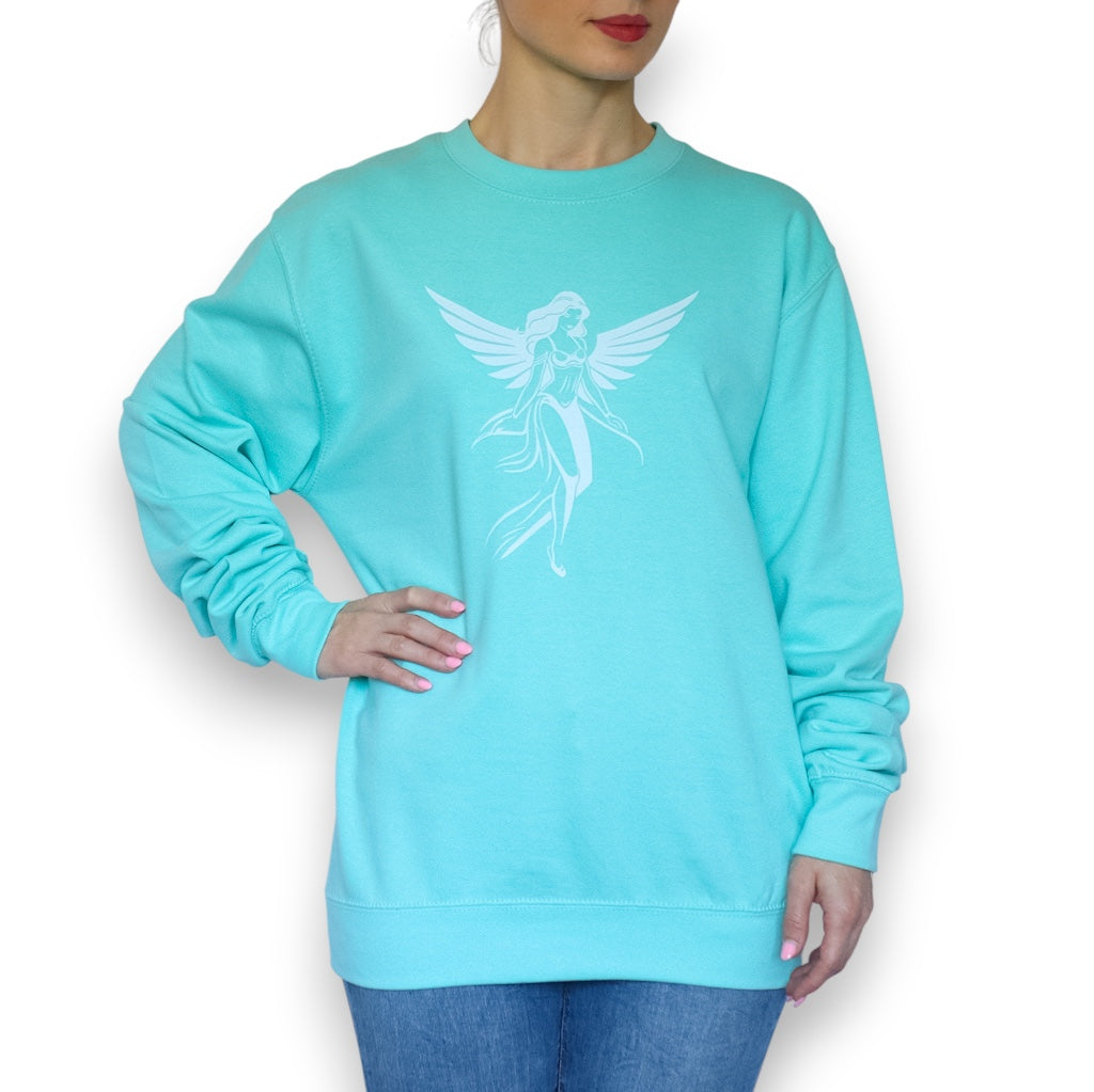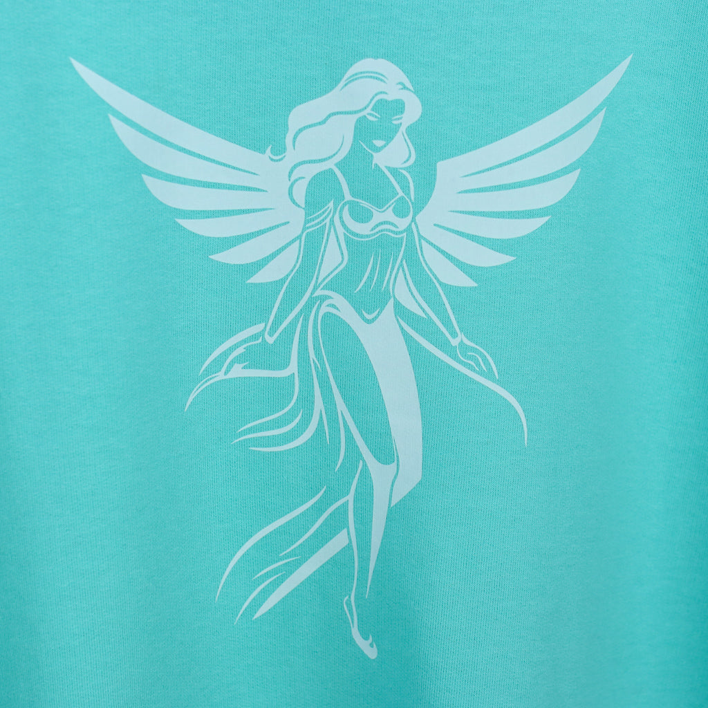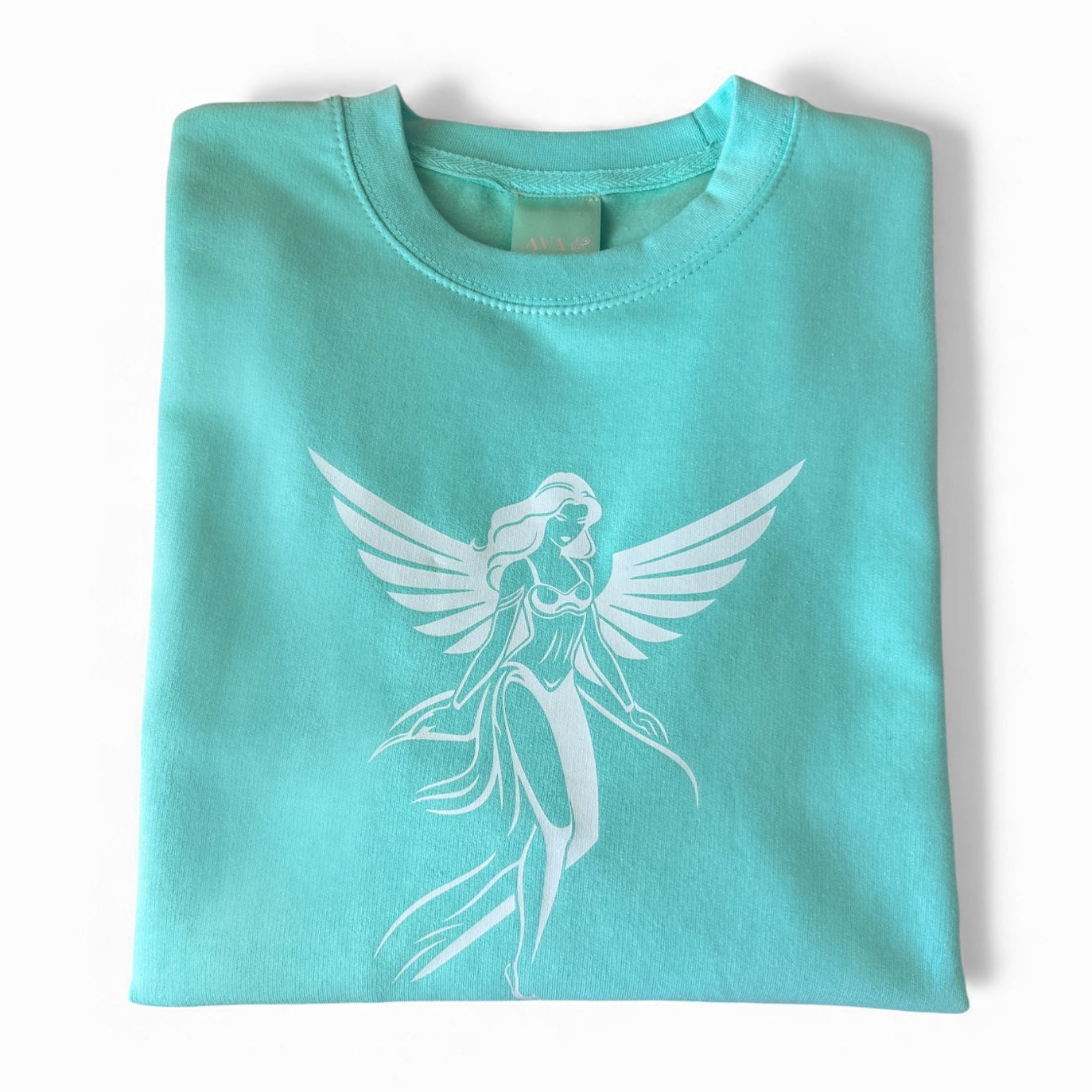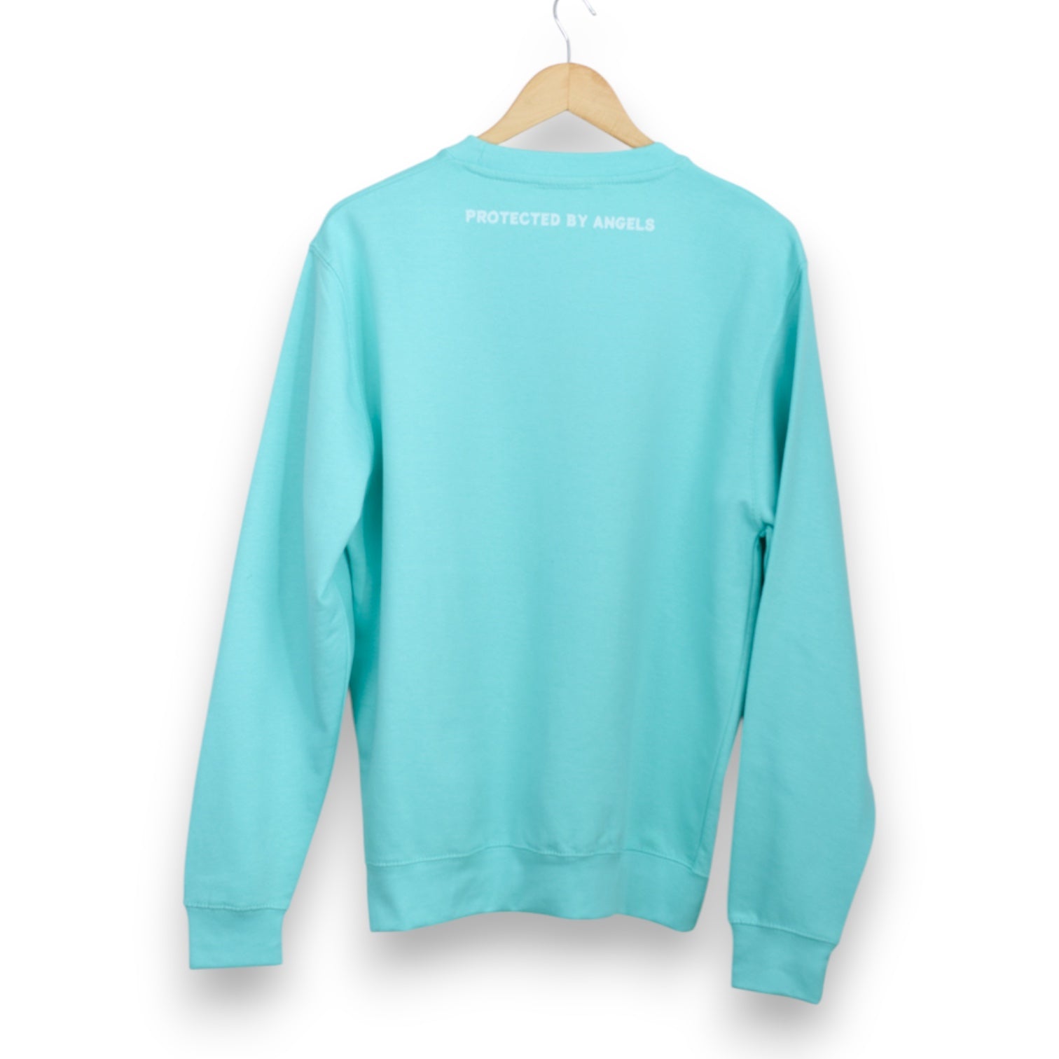 A soft, comfortable dark blue/green sweatshirt featuring a large Angel girl print on the front and 'Protected by Angels' text on the back.