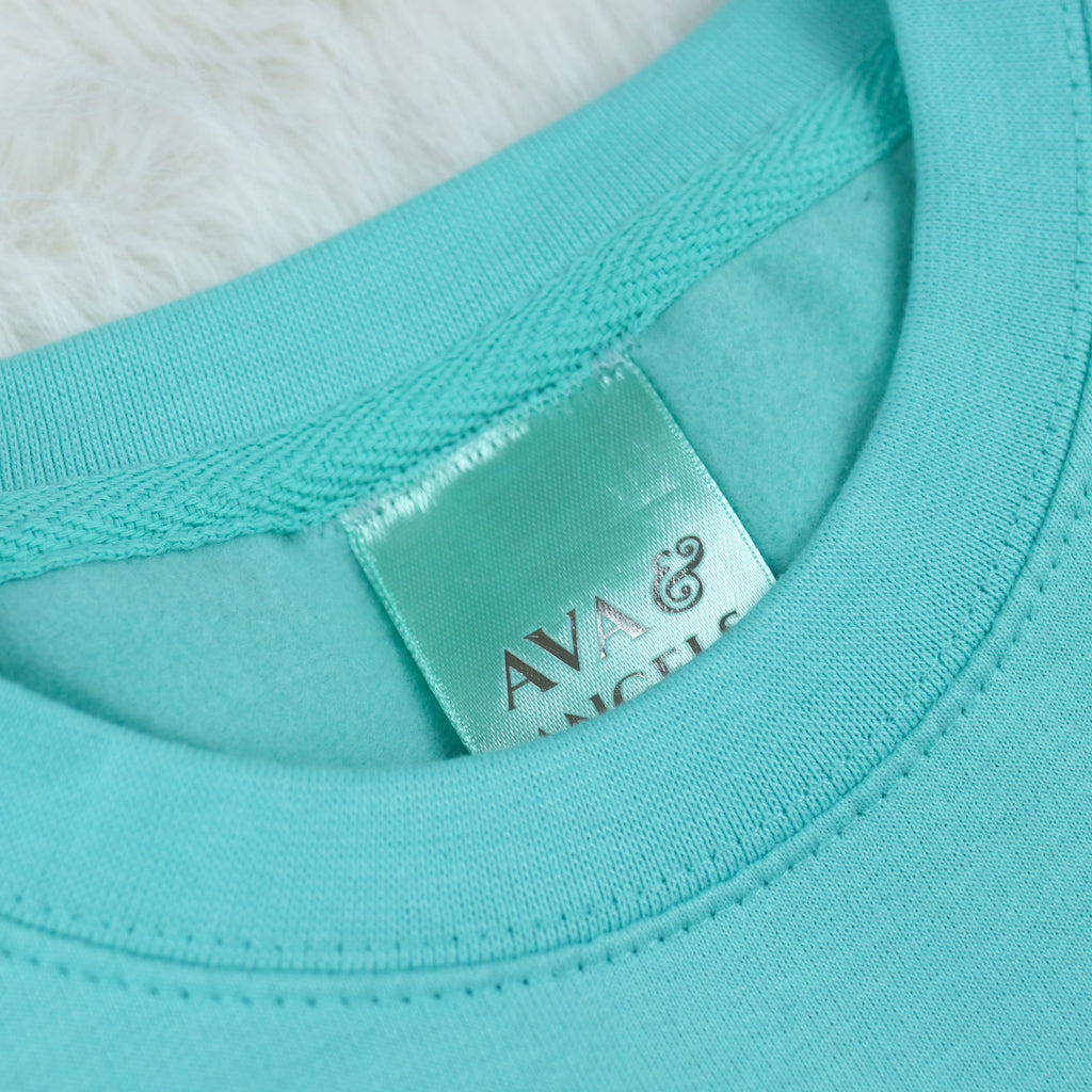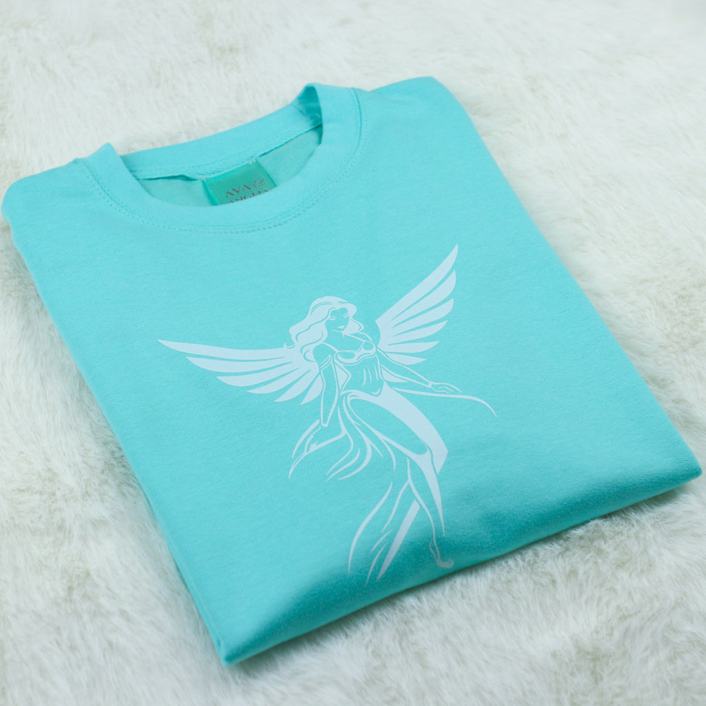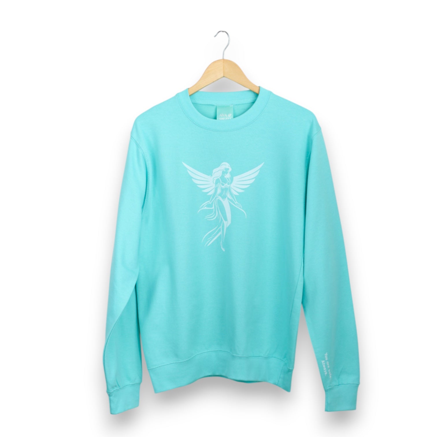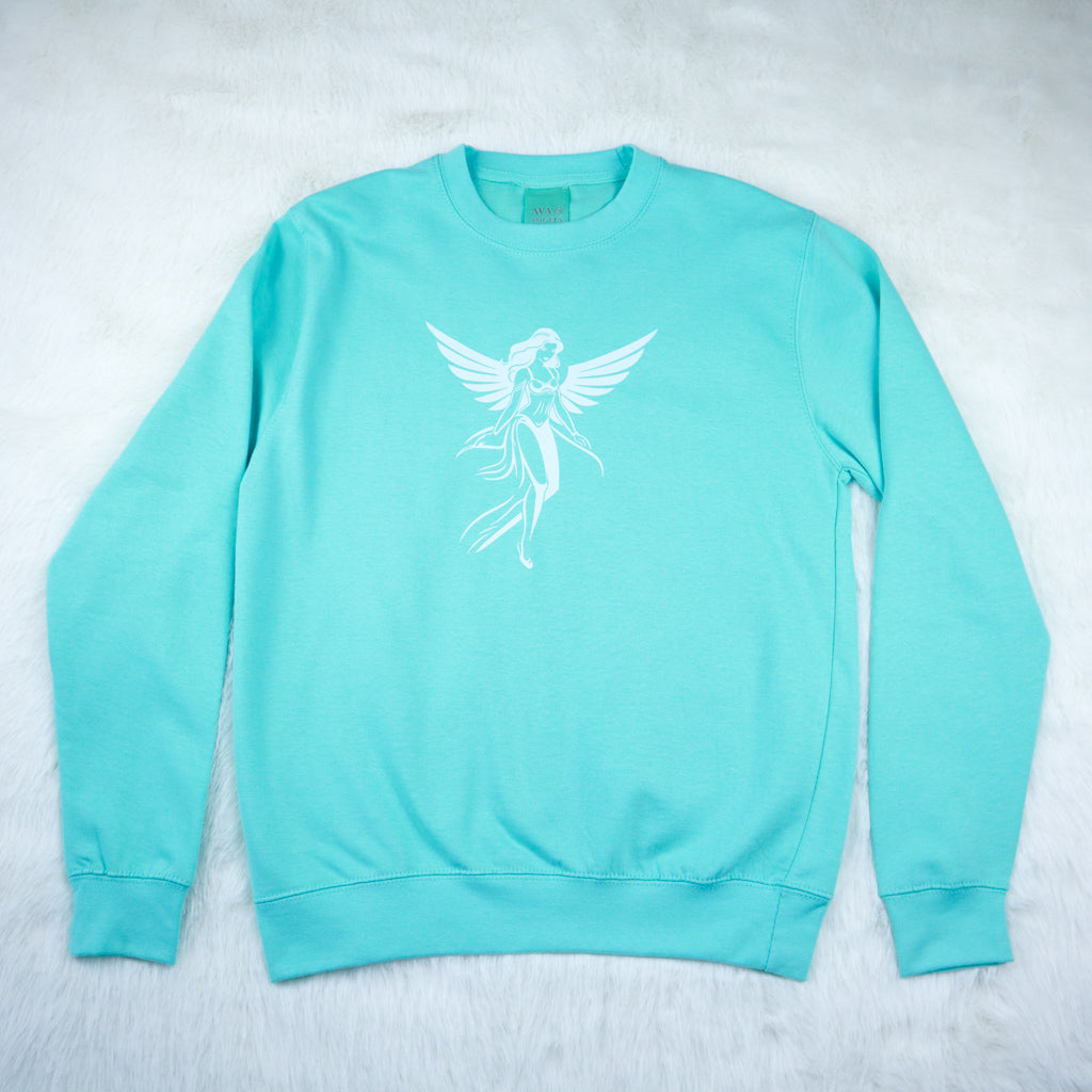 A soft, comfortable dark blue/green sweatshirt featuring a large Angel girl print on the front and 'Protected by Angels' text on the back.