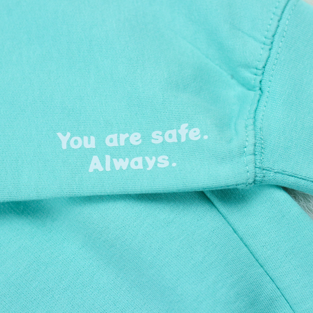 On the inner left sleeve, the message “you are safe. Always.” is applied in white HTV, a simple, reassuring note that stays close without being loud or visible on the outside.