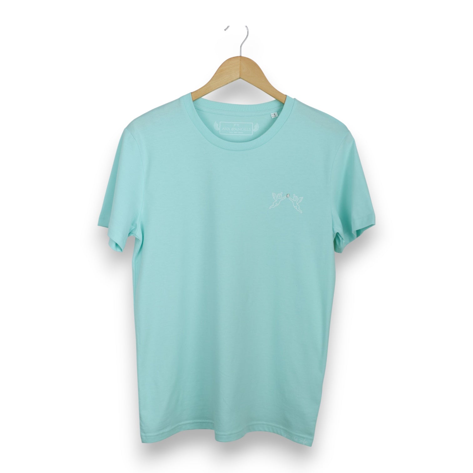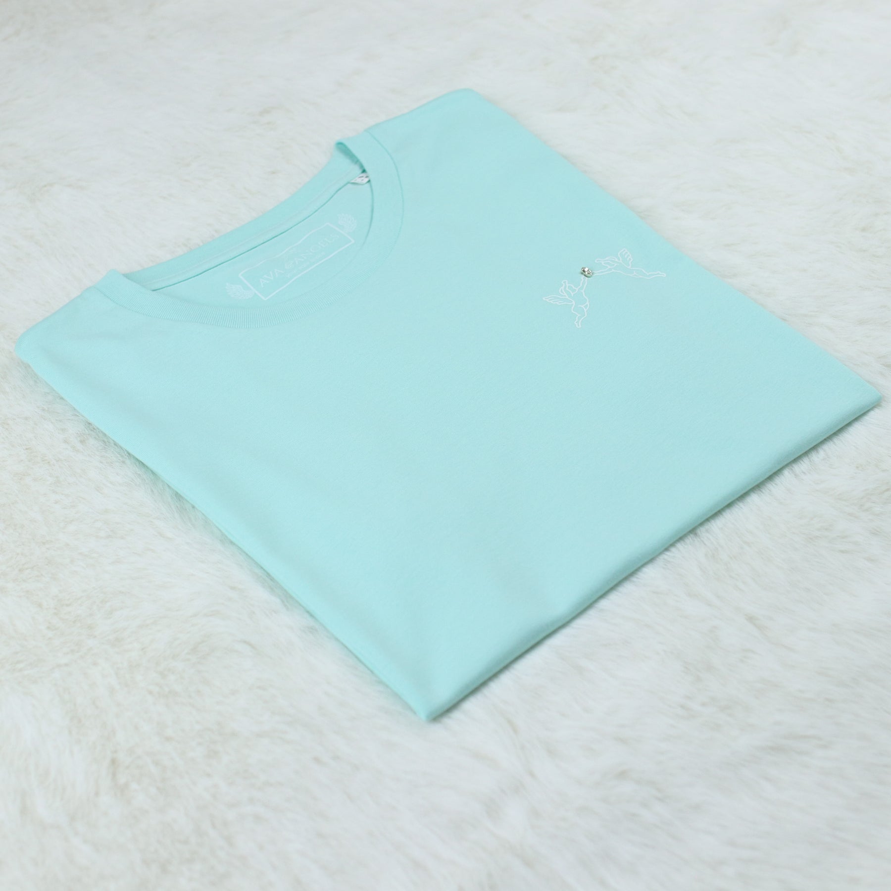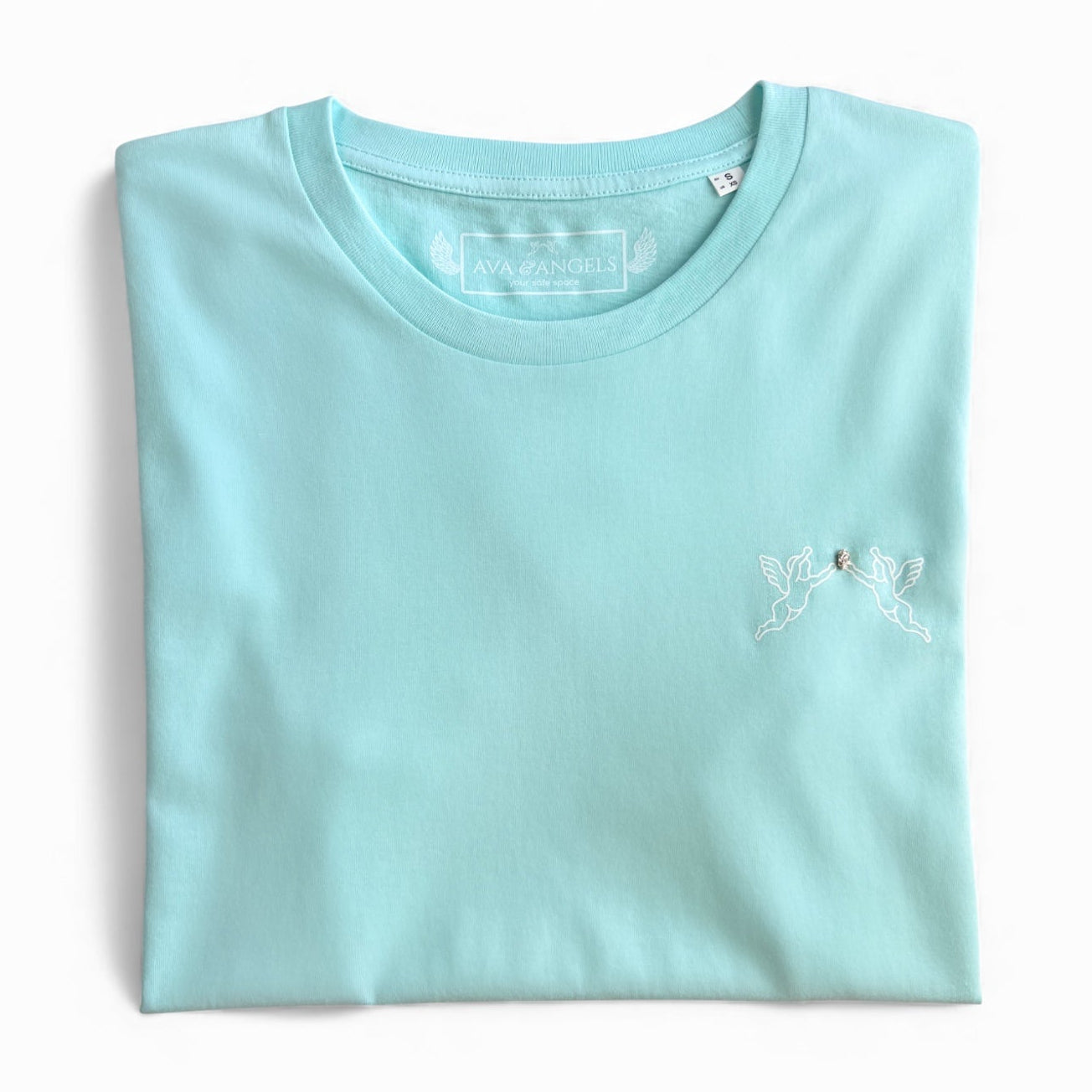 This light green/blue t-shirt features a delicate printed design on the chest: two small white angels facing each other, holding one tiny crystal together in a secure metal setting. The artwork is subtle, pretty, and easy to style — a gentle printed detail that adds a touch of charm without overwhelming the look.