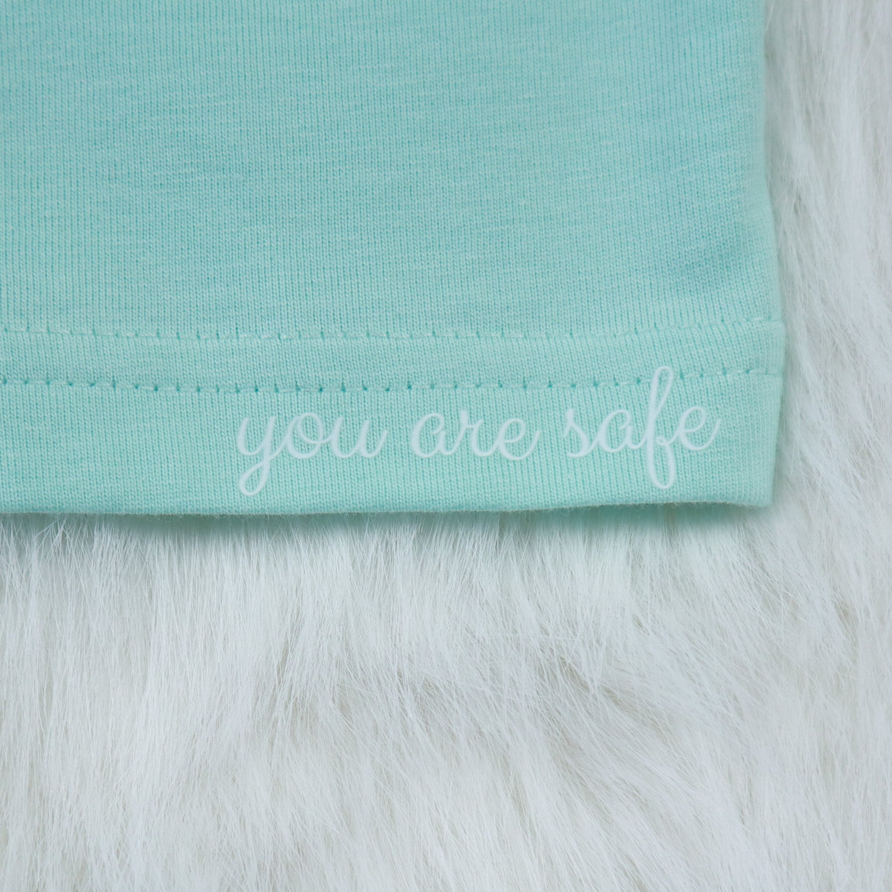 A small hidden message is placed on the bottom seam of the t-shirt. It simply reads: you are safe. A quiet reminder for you to carry with you throughout the day.