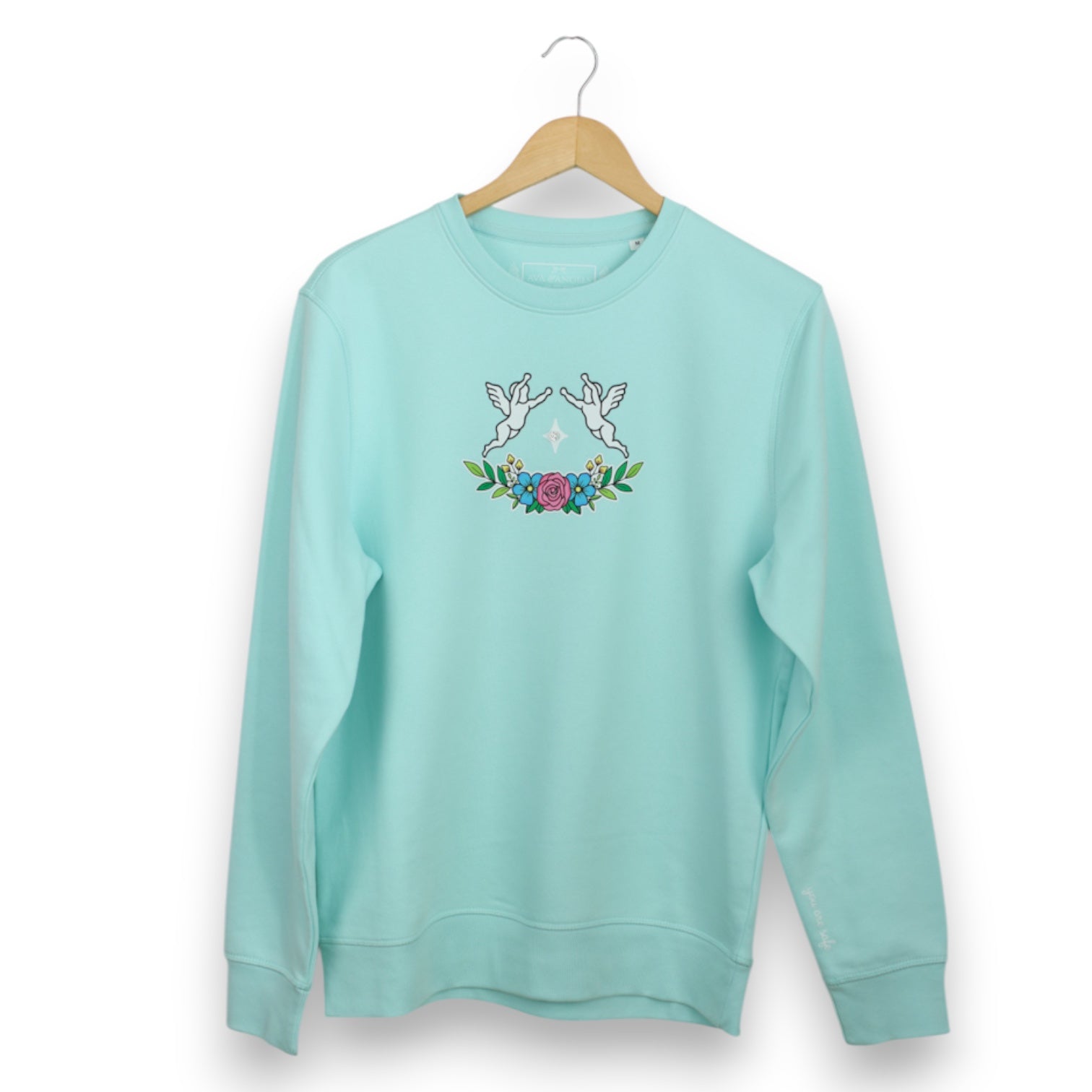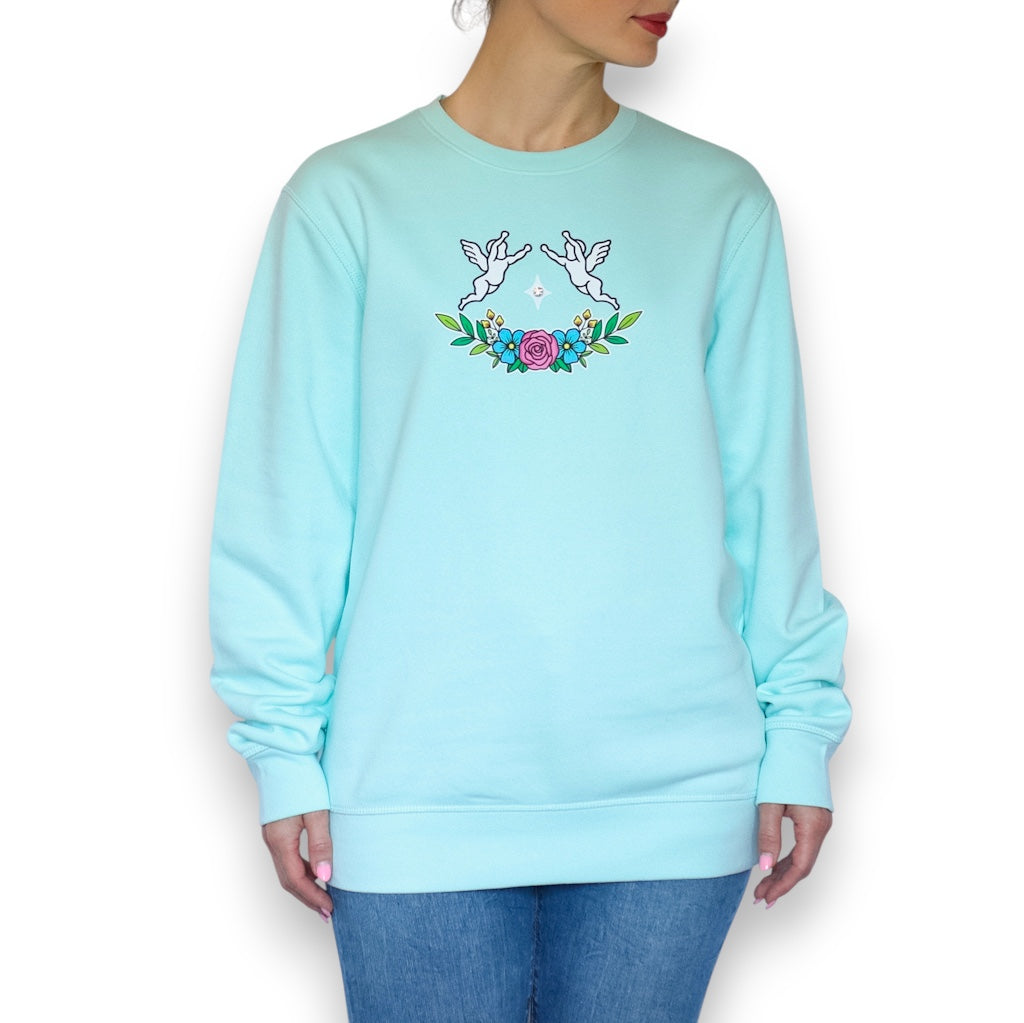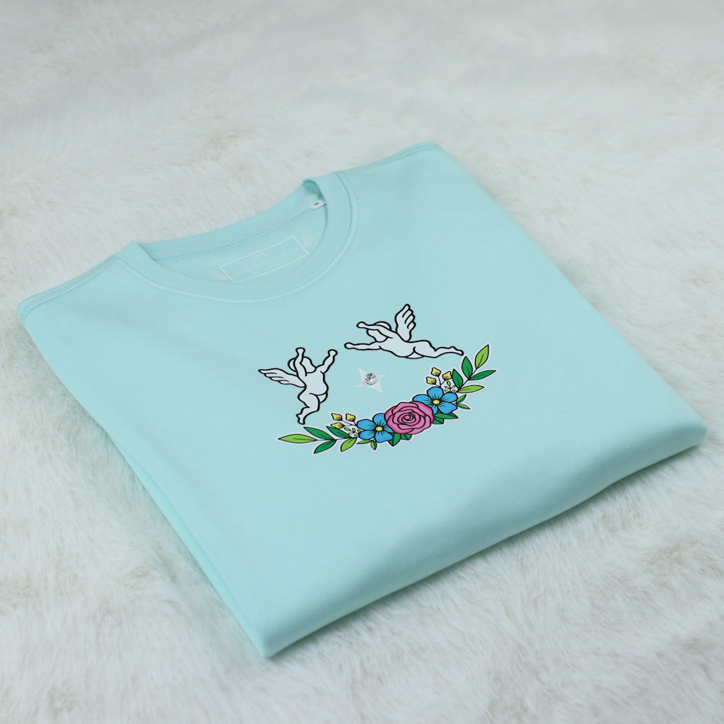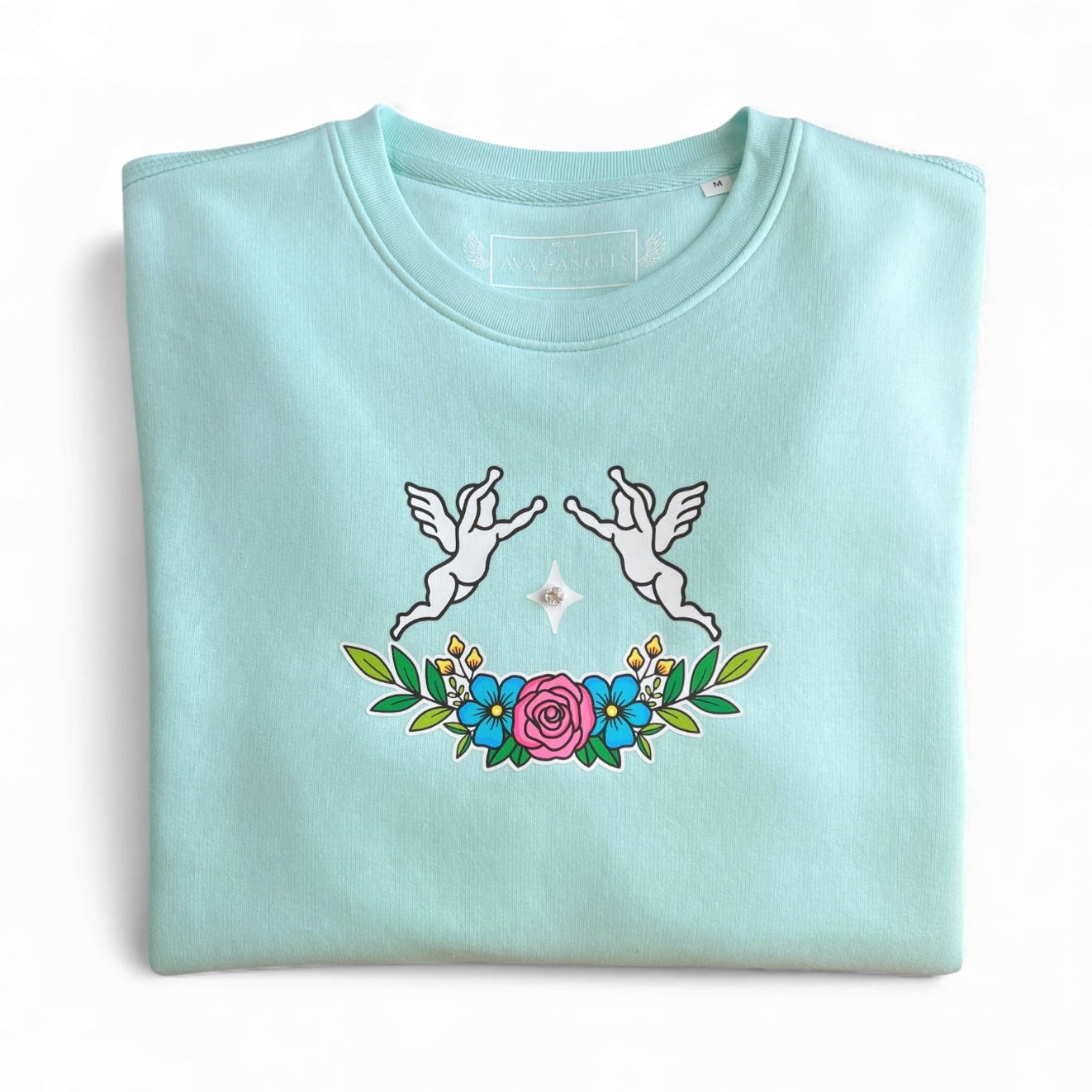 A soft, comfortable light blue/green sweatshirt featuring a large, colourful printed design on the front. The artwork includes two angels surrounded by floral elements, finished with a hand sewn crystal in the centre.