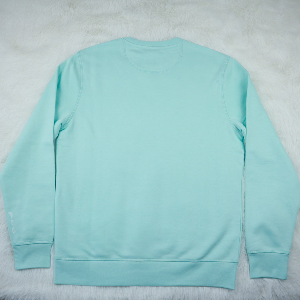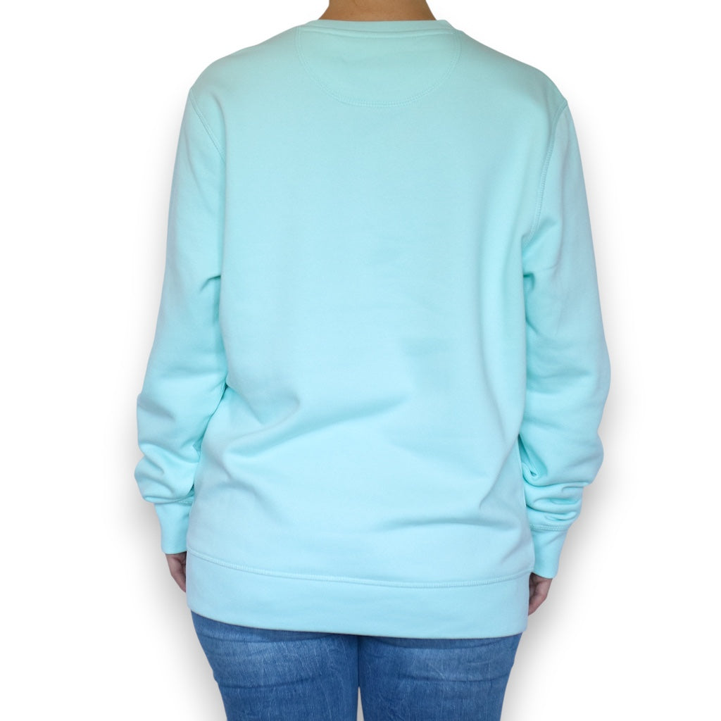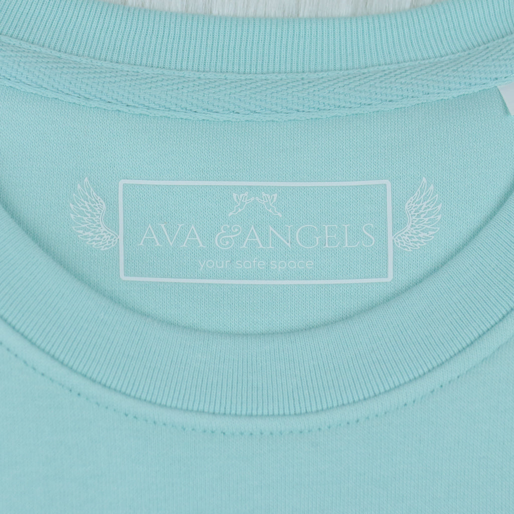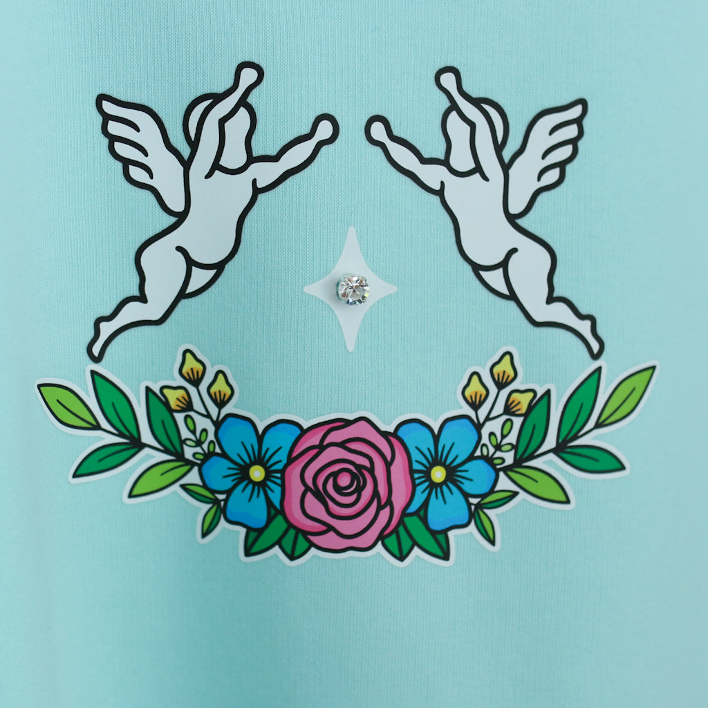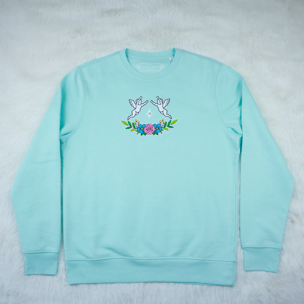 A soft, comfortable light blue/green sweatshirt featuring a large, colourful printed design on the front. The artwork includes two angels surrounded by floral elements, finished with a hand sewn crystal in the centre.