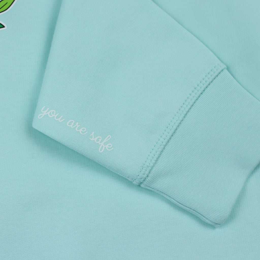 On the inner left sleeve, the message “you are safe” is applied in white HTV, a simple, reassuring note that stays close without being loud or visible on the outside.