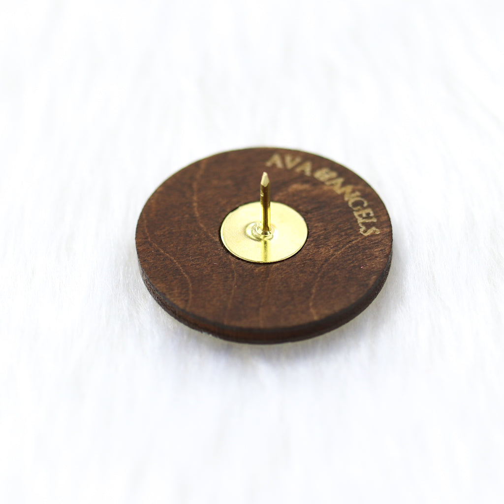 This circular wooden pin is laser cut, laser engraved, and hand painted in calming colours to match the rest of the collection. The smooth birch plywood gives it a natural feel, while the engraved details bring the design to life.